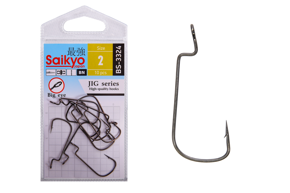 Крючок BS-3324 имеет большое ушко, благодаря которому его не заклинивает на арматуре шарнирных грузил. При проводке приманка движется более свободно и естественно. Практически прямой поддев обеспечивает легкое проскальзывание его в теле приманки, при поклевке освобождая жало крючка для эффективной подсечки. Средняя толщина проволоки. Используются в классическом джиге и во многих других оснастках: поводковые, техасские, каролинские, Drop-shot.